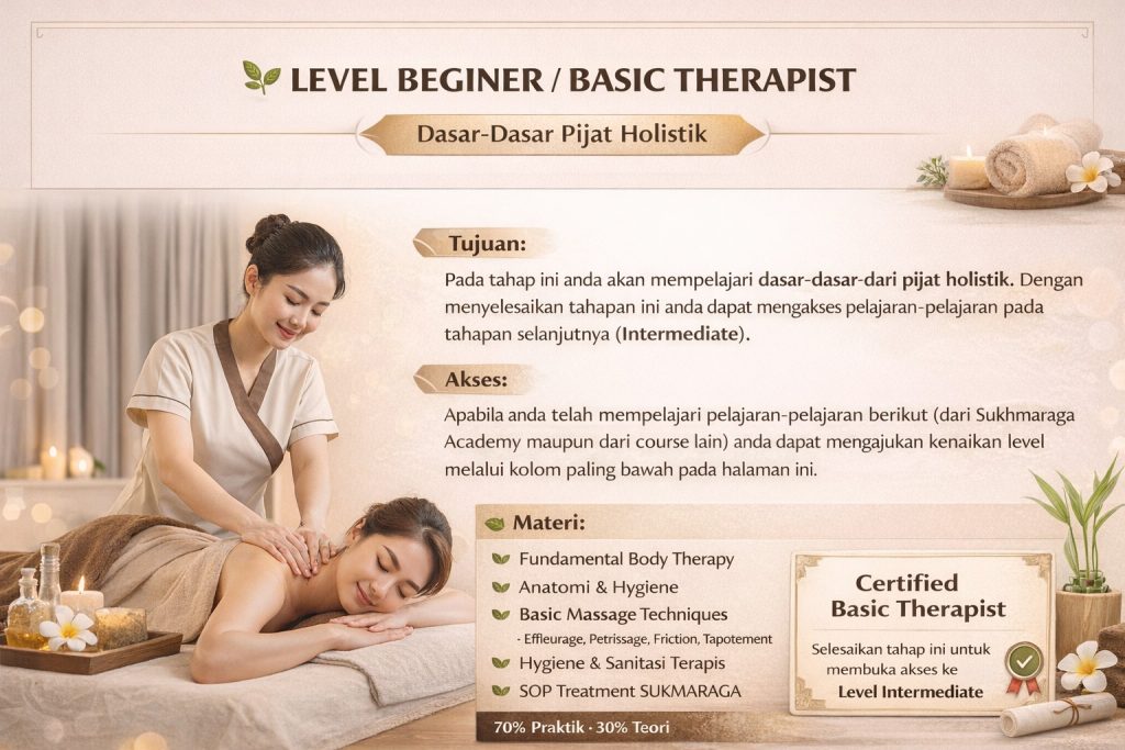 Pada tahap ini anda akan mempelajari dasar-dasar dari pijat holistik, dengan menyelesaikan tahapan ini anda dapat mengakses pelajaran-pelajaran pada tahapan selanjutnya (Intermediate). Apabila anda telah mempelajari pelajaran-pelajaran berikut (dari Sukhmaraga Academy maupun dari course lain) anda dapat mengajukan kenaikan level melalui kolom paling bawah pada halaman ini.